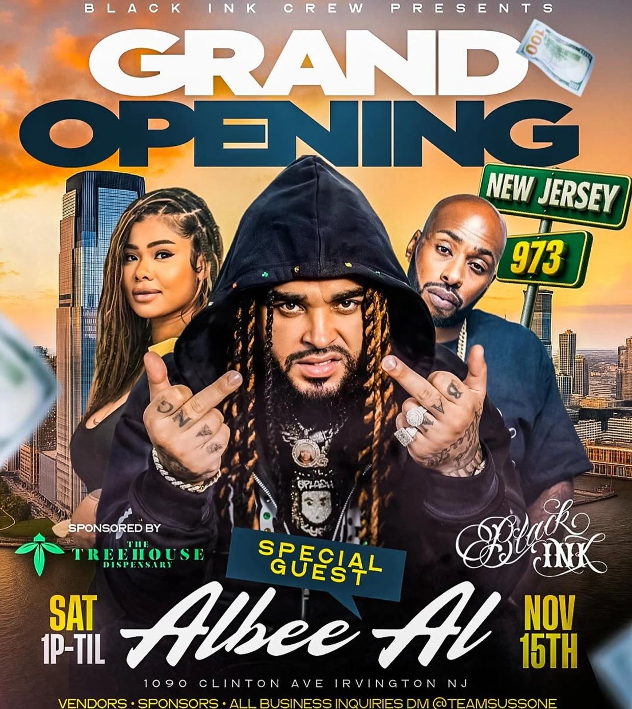 Black Ink Crew posted their Grand Opening flyer for New Jersey at 10:30 PM on a Friday night on November 14. AM TO AM STUDIO shared the flyer at 11:45 PM and tagged Black Ink Crew CEO Ceaser Emanuel, tattoo artist Krystal Kills, and special guest music artist Albee al. The flyer features all three people with a grand opening time of 1 PM November 15 2025.